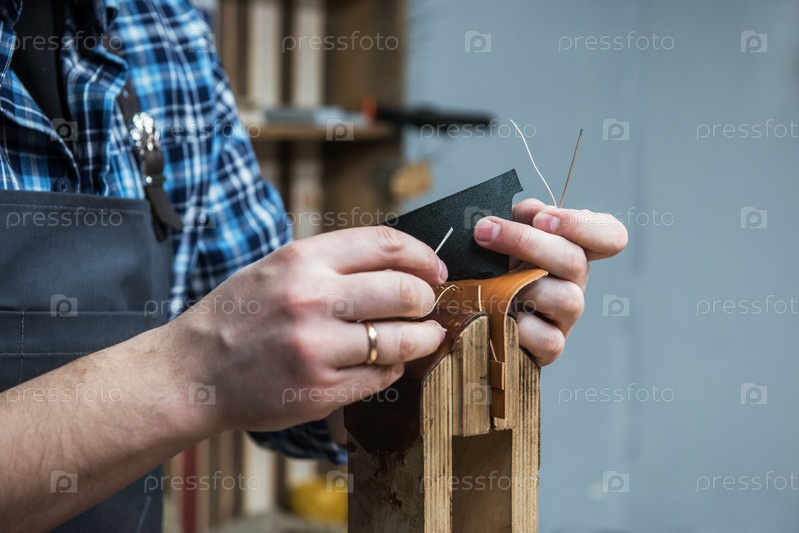 Мужчина шьет кожаный кошелек в мастерской. Концепция ручного ремесленного производства изделий из кожи