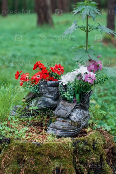 Туристический ботинок с цветами в лесу. Летний фон с забытыми ботинками и полевыми цветами. Концепция летнего сезона и путешествия