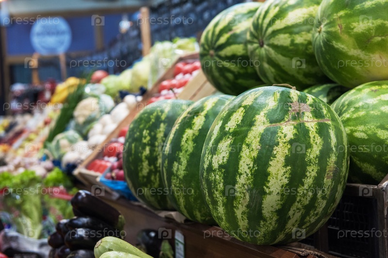 Спелые арбузы на фермерском рынке: свежие органические полезные арбузы в продуктовом магазине