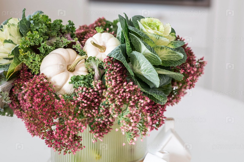 Натюрморт. Букет декоративной капусты в вазе и тыквы в интерьере домашней кухни. Уютная осенняя концепция