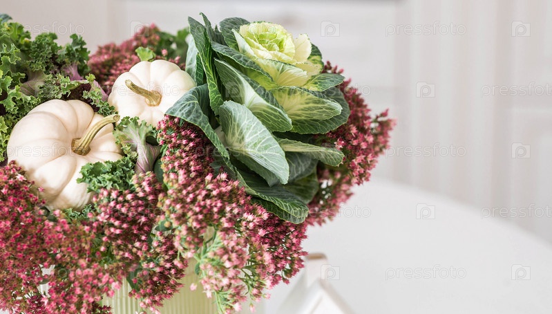 Натюрморт. Букет декоративной капусты в вазе и тыквы в интерьере домашней кухни. Уютная осенняя концепция