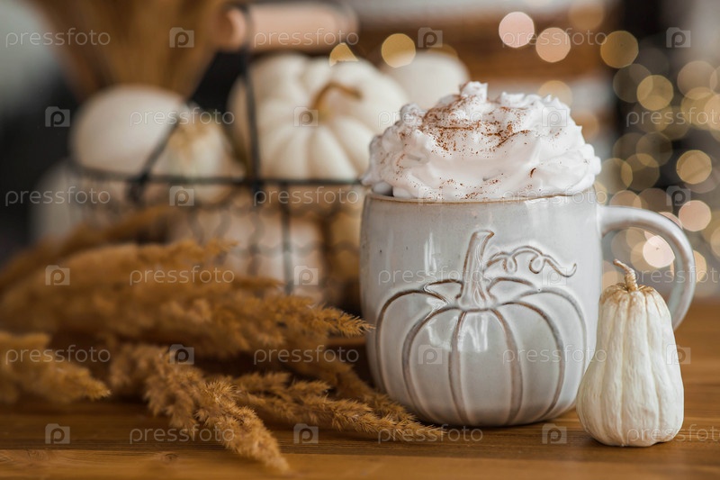 Вкусный тыквенный латте со взбитыми сливками и корицей в кружке на столе в интерьере гостиной. Осенний декор в доме. Скандинавский стиль