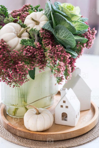 Натюрморт. Букет декоративной капусты в вазе, тыквы и белые домики на столе в интерьере домашней кухни. Уютная осенняя концепция