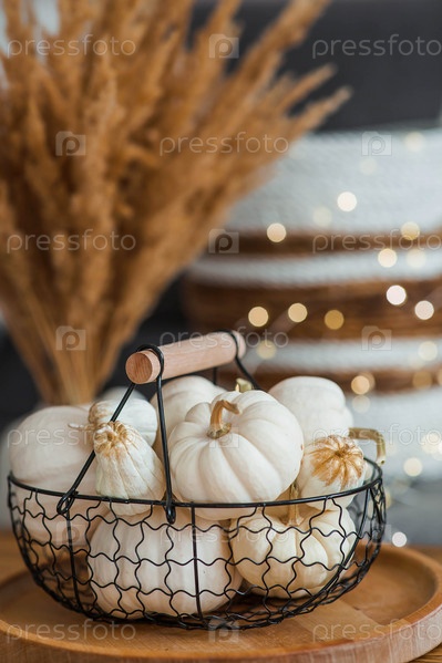 Натюрморт. Белые декоративные тыквы в железной чердачной корзине на столе в домашнем интерьере гостиной на фоне красивого бокового света. Концепция уютной осени