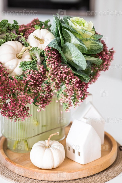 Натюрморт. Букет декоративной капусты в вазе, тыквы и белые домики на столе в интерьере домашней кухни. Уютная осенняя концепция