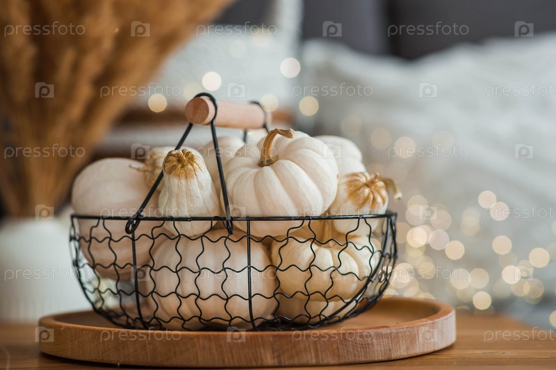 Натюрморт. Белые декоративные тыквы в железной чердачной корзине на столе в домашнем интерьере гостиной на фоне красивого бокового света. Концепция уютной осени