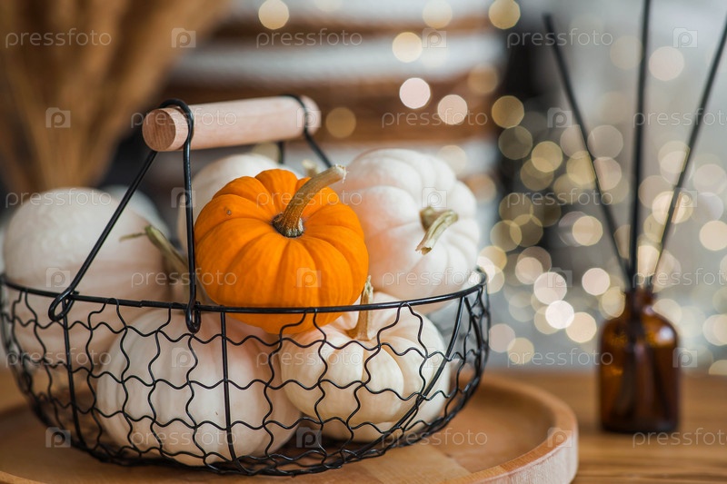 Аромадиффузор. Осенние ароматизированные духи для дома в стеклянном флаконе с палочками в качестве освежителя воздуха в доме и тыквами. Ароматерапия, уютная атмосфера, комфорт и расслабление