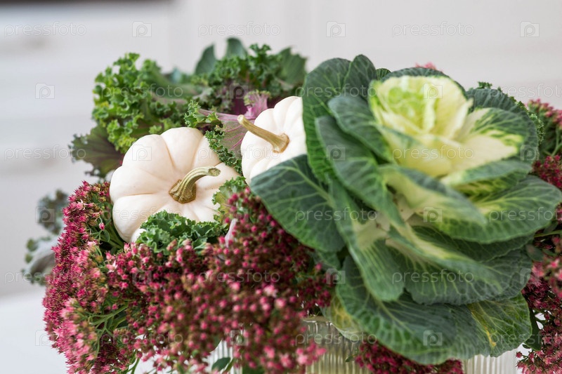 Натюрморт. Букет декоративной капусты в вазе и тыквы в интерьере домашней кухни. Уютная осенняя концепция