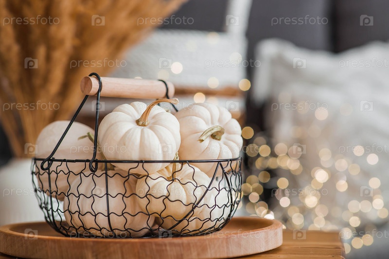Натюрморт. Белые декоративные тыквы в железной чердачной корзине на столе в домашнем интерьере гостиной на фоне красивого бокового света. Концепция уютной осени