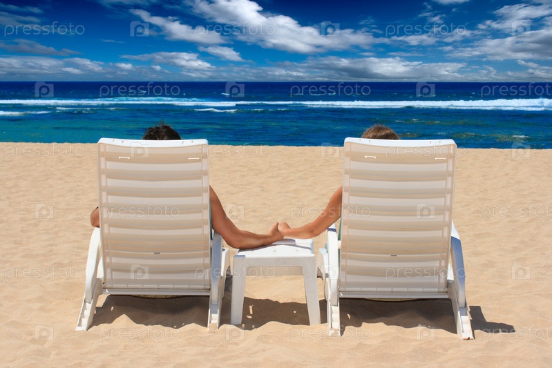 Влюбленная пара держится за руки, сидя в шезлонгах на берегу океана