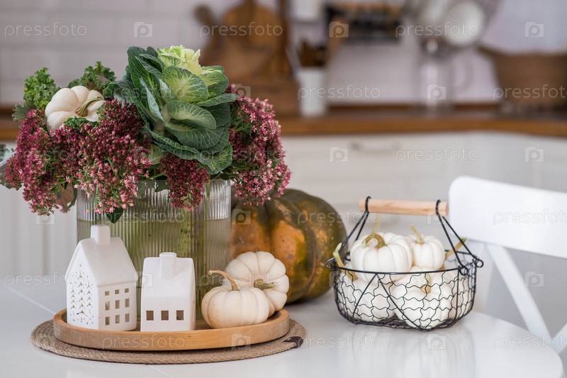 Натюрморт. Букет декоративной капусты в вазе, тыквы и белые домики на столе в интерьере домашней кухни. Уютная осенняя концепция