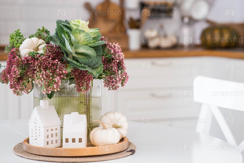 Натюрморт. Букет декоративной капусты в вазе, тыквы и белые домики на столе в интерьере домашней кухни. Уютная осенняя концепция