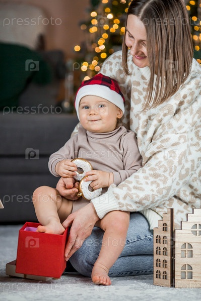 Красивый маленький светловолосый мальчик 1 года сидит с мамой на фоне елки. Концепция празднования Рождества и Нового года