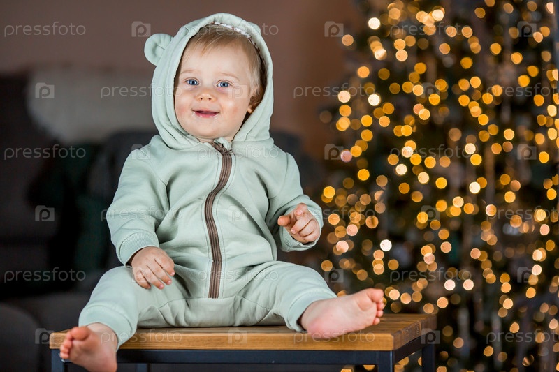 Семья и дети. Красивый белокурый мальчик 1 года на фоне елки. Концепция празднования Рождества и Нового года