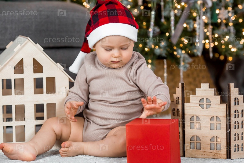 Красивый маленький светловолосый мальчик 1 года в шапке Санта-Клауса сидит на фоне елки. Концепция празднования Рождества и Нового года