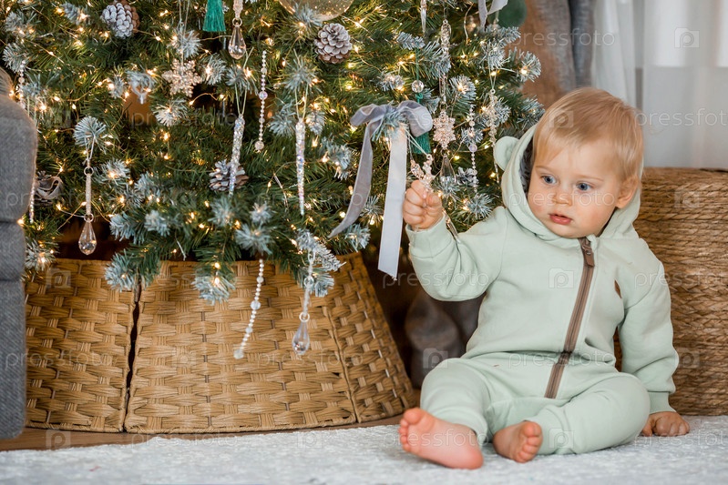 Красивый маленький светловолосый мальчик 1 года в шапке Санта-Клауса сидит на фоне елки. Концепция празднования Рождества и Нового года