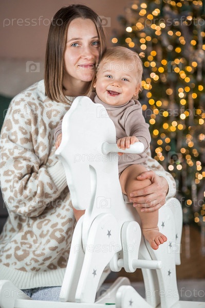 Семья. Красивый белокурый мальчик 1 года сидит на лошади с мамой на фоне елки. Концепция празднования Рождества и Нового года