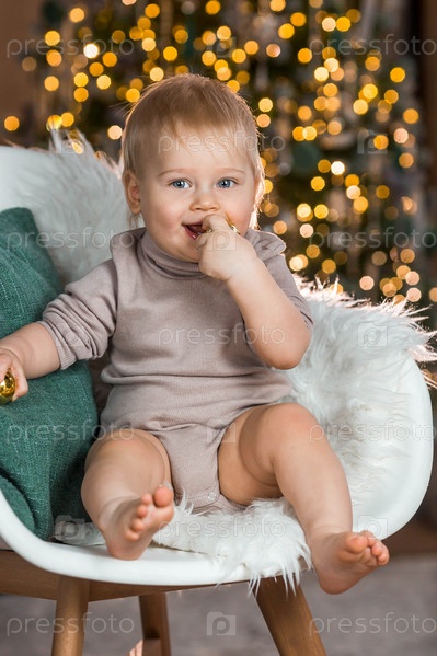Красивый маленький светловолосый мальчик 1 года в шапке Санта-Клауса сидит на фоне елки. Концепция празднования Рождества и Нового года