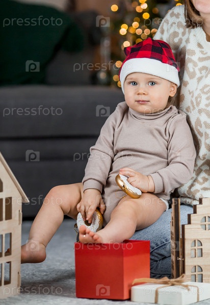 Красивый маленький светловолосый мальчик 1 года в шапке Санта-Клауса сидит на фоне елки. Концепция празднования Рождества и Нового года