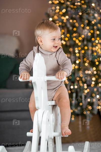 Красивый маленький светловолосый мальчик 1 года в шапке Санта-Клауса сидит на фоне елки. Концепция празднования Рождества и Нового года