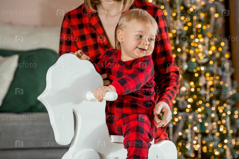 Красивый маленький светловолосый мальчик 1 года в шапке Санта-Клауса сидит на фоне елки. Концепция празднования Рождества и Нового года