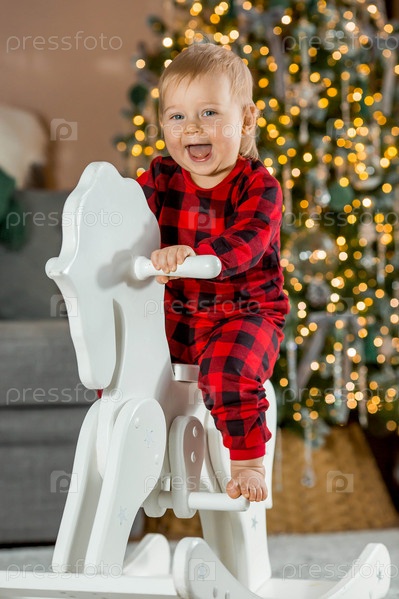 Красивый маленький светловолосый мальчик 1 года в шапке Санта-Клауса сидит на фоне елки. Концепция празднования Рождества и Нового года