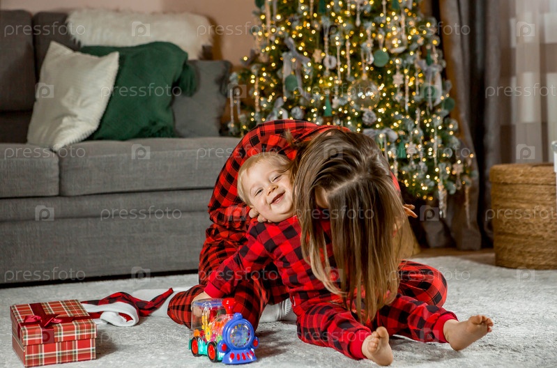 Семья. Красивый маленький светловолосый мальчик 1 года сидит с мамой на фоне елки. Концепция празднования Рождества и Нового года