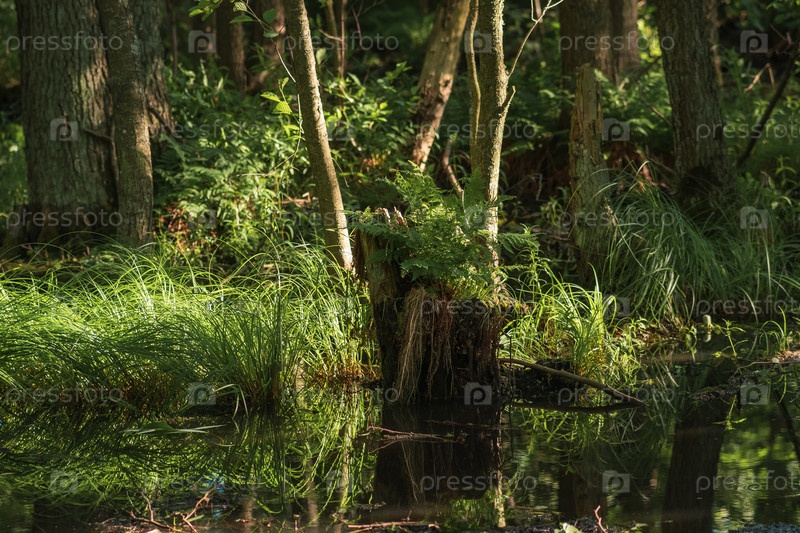 Тенистое болото, лесистая водно-болотная угодье с осокой и пнями