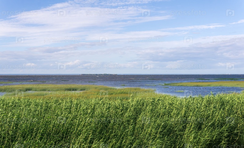 Прибрежный пейзаж, побережье Балтийского моря с тростниковыми зарослями на переднем плане