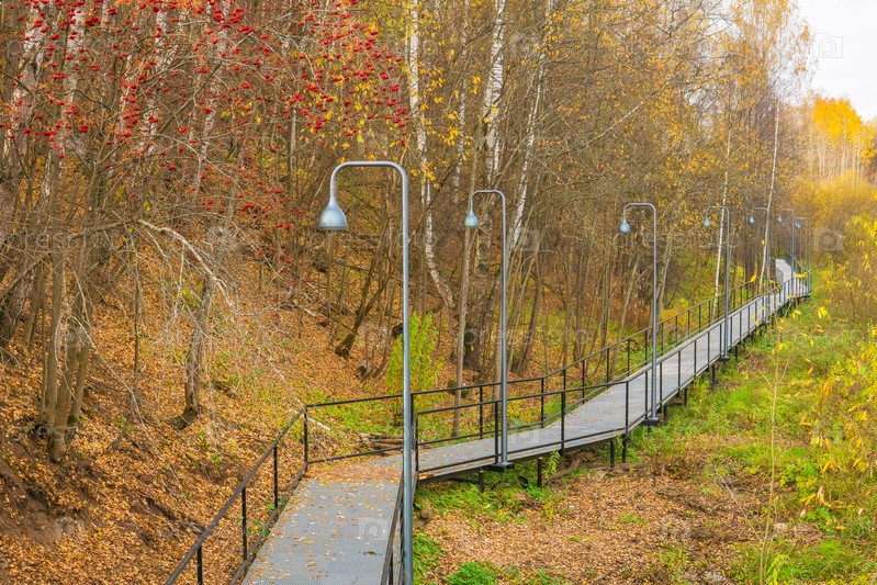 Металлические мосты с фонарями на экотропе в осеннем горном лесу