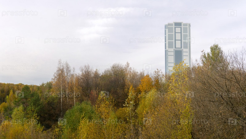 Многоэтажное здание на вершине холма с осенними деревьями