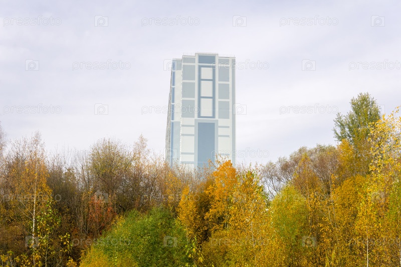 Многоэтажное здание на вершине холма с осенними деревьями