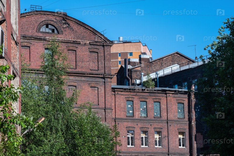 Промышленный фон, старинные здания старых заводских цехов из красного кирпича