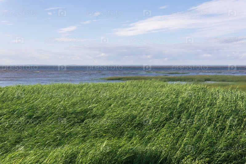 Прибрежный пейзаж, побережье Балтийского моря с тростниковыми зарослями на переднем плане