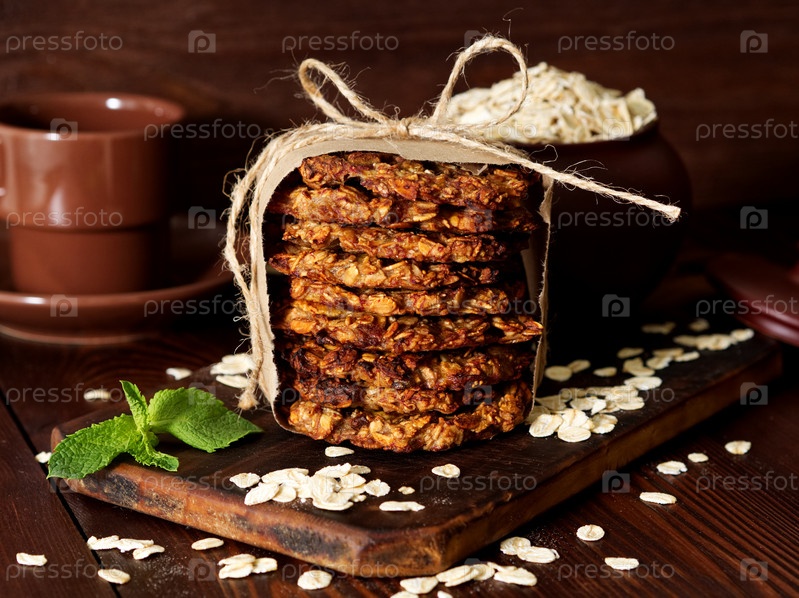 Домашнее овсяное печенье с бананом, овсом, орехами, яйцами и без муки на коричневом темном деревянном столе, вид сбоку