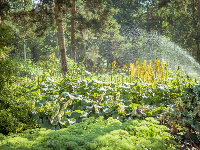 Ландшафтный дизайн, красивый парк с цветами и хвойными деревьями, Котка, парк Исопуйсто, Финляндия. Автоматическая система полива растений