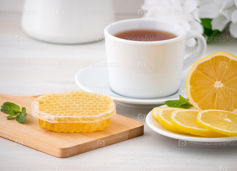 Белая чашка с чаем, дольками лимона и медом в сотах на белом деревянном столе, вид сбоку