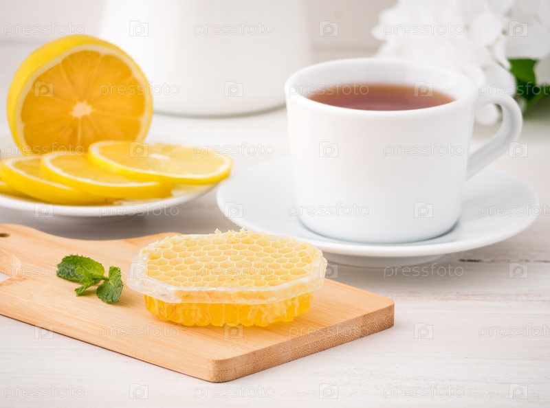 Белая чашка с чаем, дольками лимона и медом в сотах на белом деревянном столе, вид сбоку