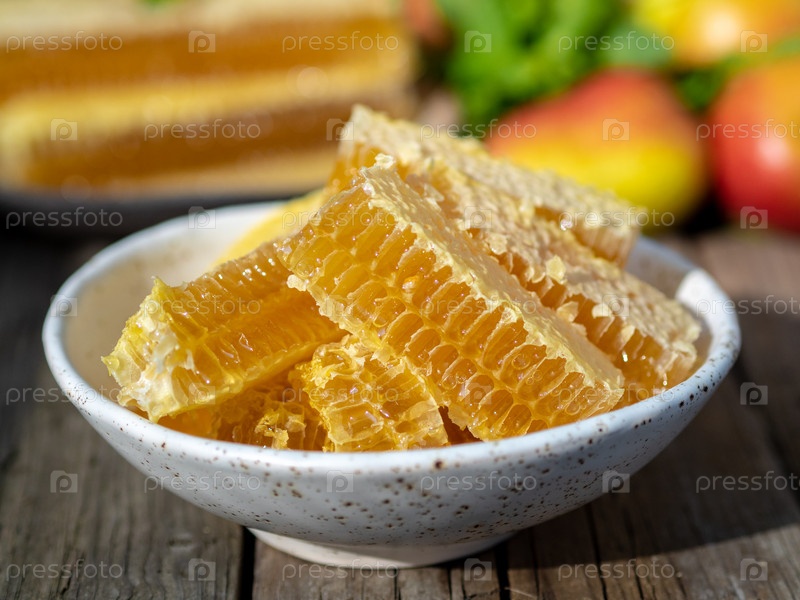 Мед в сотах, крупный план, на белой керамической тарелке, на деревянном деревенском столе, вид сбоку, солнечный свет в солнечный день