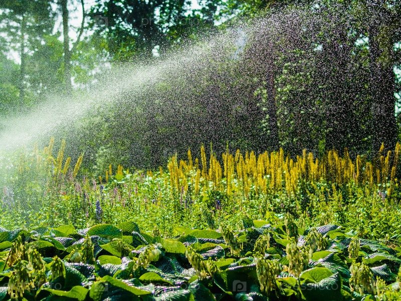 Ландшафтный дизайн, красивый парк с цветами и хвойными деревьями, Котка, парк Исопуйсто, Финляндия. Автоматическая система полива растений