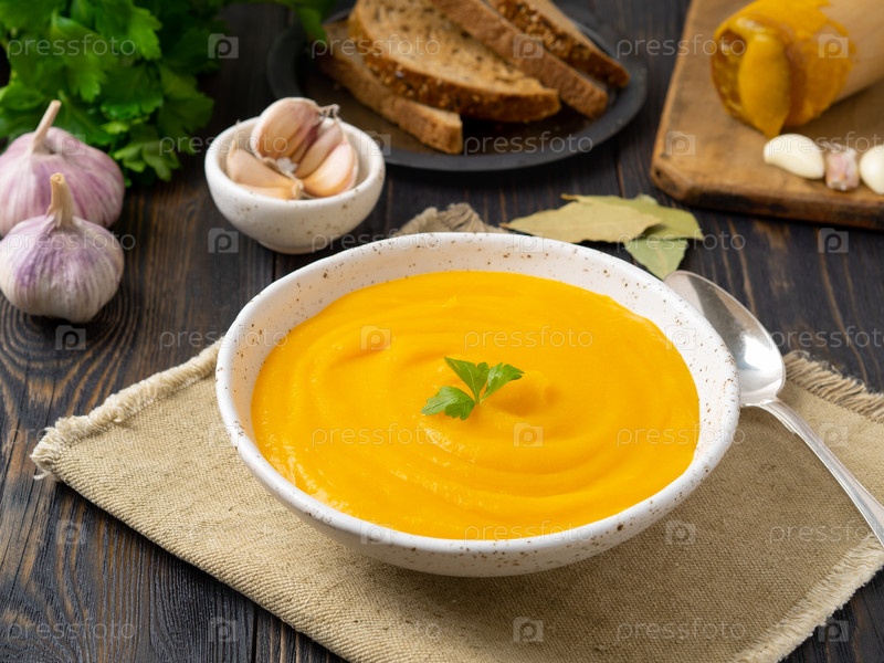 Тыквенный суп-пюре в белой тарелке, семена тыквы, хлеб, чеснок на темном деревянном фоне