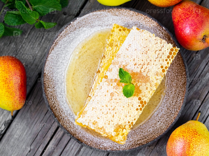 Мед в сотах, крупный план, на коричневой керамической тарелке, на старом сером деревянном деревенском столе, вид сверху