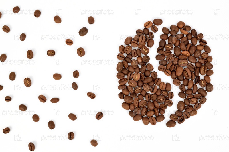 Крупные кофейные зерна, выложенные в виде кофейного зерна на белом фоне