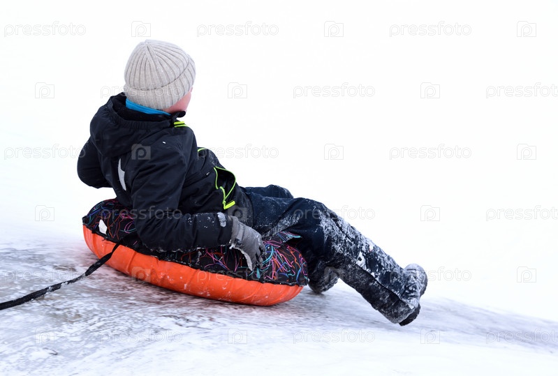 Мальчик катается на надувной ватрушке по ледяной горке в парке