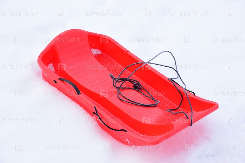 Красные пластмассовые санки на снегу