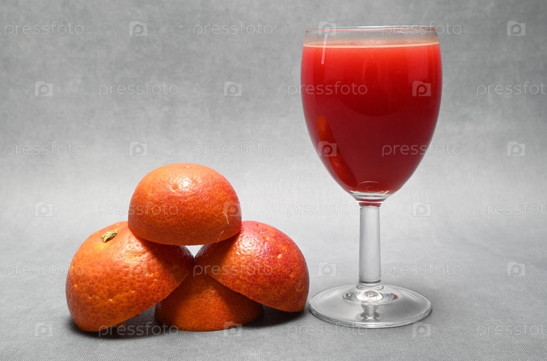 Бокал свежевыжатого сока из красных апельсинов. Рядом лежат отжатые половинки, сложенная горкой