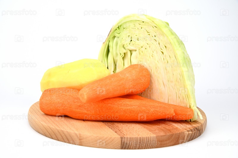 Капуста, очищенная морковь и картофель, выложенные на разделочную доску