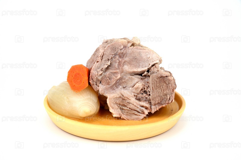 Кусок отварной свинины вместе с вареным луком и морковью, выложенные на деревянную тарелку