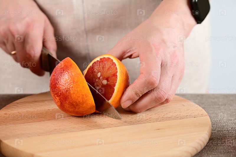 Женщина разрезает красный апельсин пополам