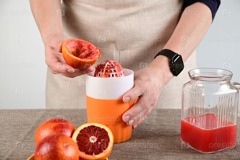 Женщина держит в правой руке половинку апельсина, из которого она выжала сок в соковыжималке